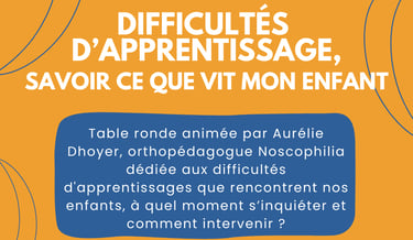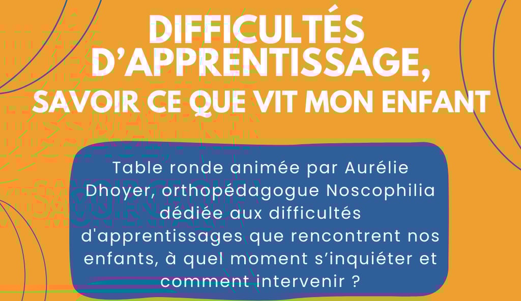 – Difficultés d’apprentissage, comment savoir ce que vit mon enfant, animée par Aurélie Dhoyer, orthopédagogue Noscophilia et membre de l’association TousDys. Dédiée aux difficultés d’apprentissages, vous pourrez mieux comprendre ce qu’il se passe dans le cerveau de votre enfant lorsqu’il lit, mémorise, calcule etc… et appréhender les signes qui doivent vous alerter lors de difficultés scolaires, pour mieux l’accompagner dans ses apprentissages.