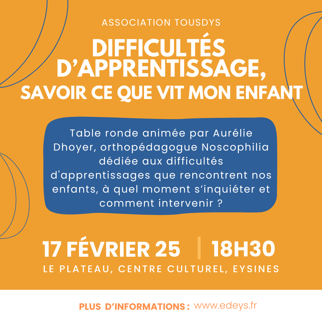 Inscriptions ici : https://www.helloasso.com/associations/tousdys/evenements/table-ronde-difficultes-d-apprentissage-comment-savoir-ce-que-vit-mon-enfant-2