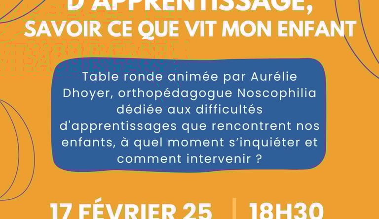 – Difficultés d’apprentissage, comment savoir ce que vit mon enfant, animée par Aurélie Dhoyer, orthopédagogue Noscophilia et membre de l’association TousDys. Dédiée aux difficultés d’apprentissages, vous pourrez mieux comprendre ce qu’il se passe dans le cerveau de votre enfant lorsqu’il lit, mémorise, calcule etc… et appréhender les signes qui doivent vous alerter lors de difficultés scolaires, pour mieux l’accompagner dans ses apprentissages.